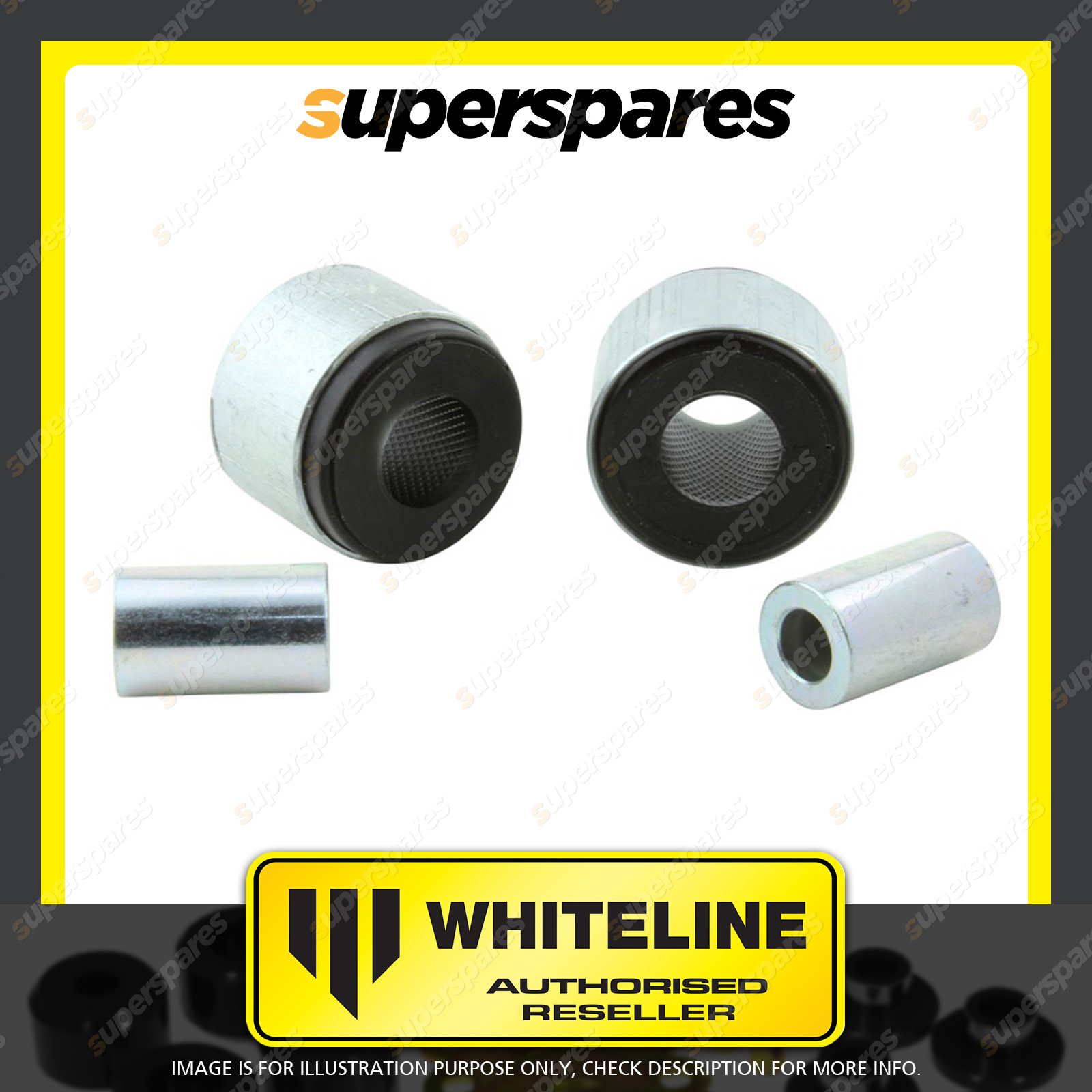| Contents : Whiteline Rear Differential - mount in cradle bushing Warranty : 3 Year / 60,000Kms Kit Contents : 2 Shell Bushings, 2 Tubes, Grease |