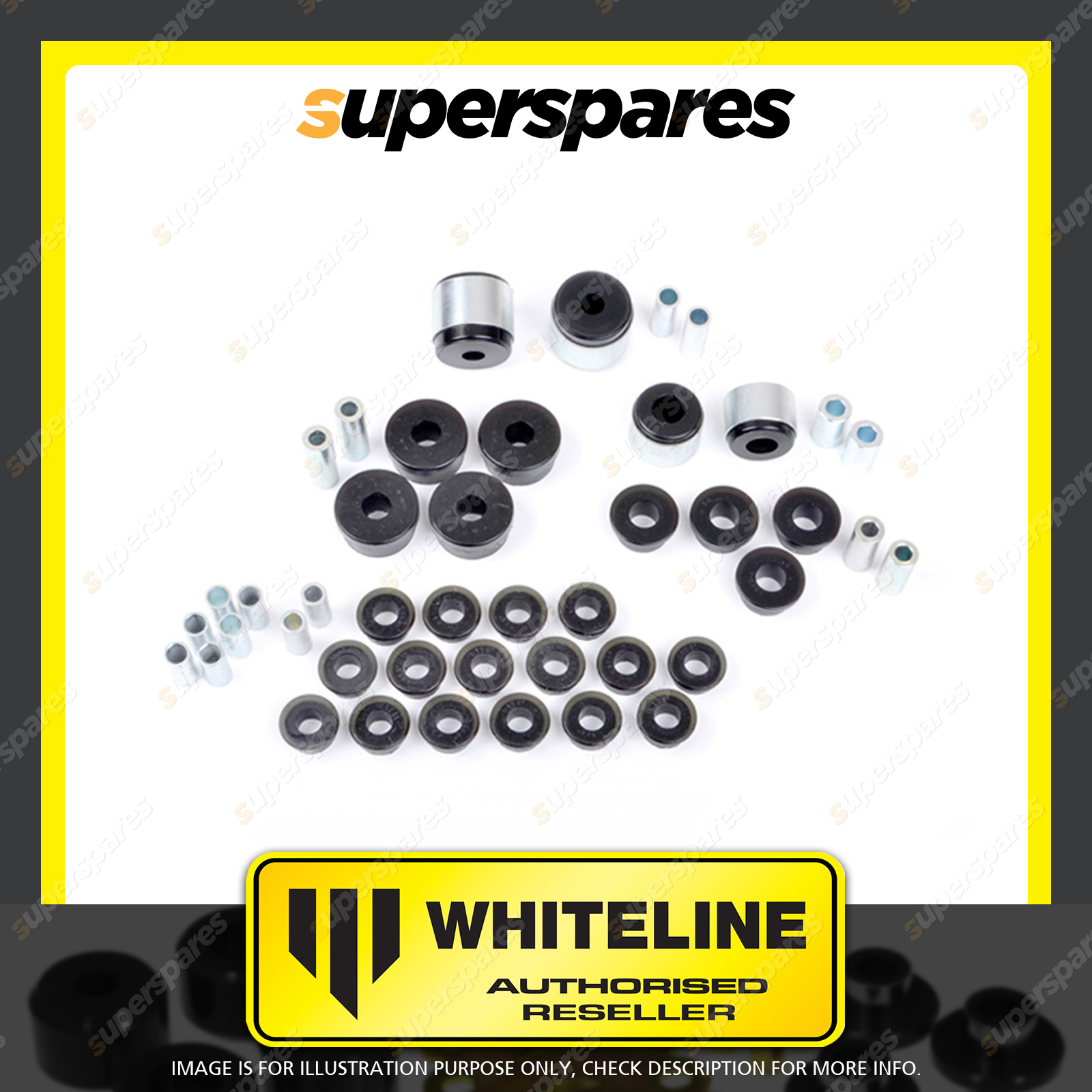 | Contents : Whiteline Rear Essential Vehicle Kit Warranty : 3 Year / 60,000Kms Kit Contents : 4 Shell Bushings, 24 Bushings, 16 Tubes, Install Guide, Grease |