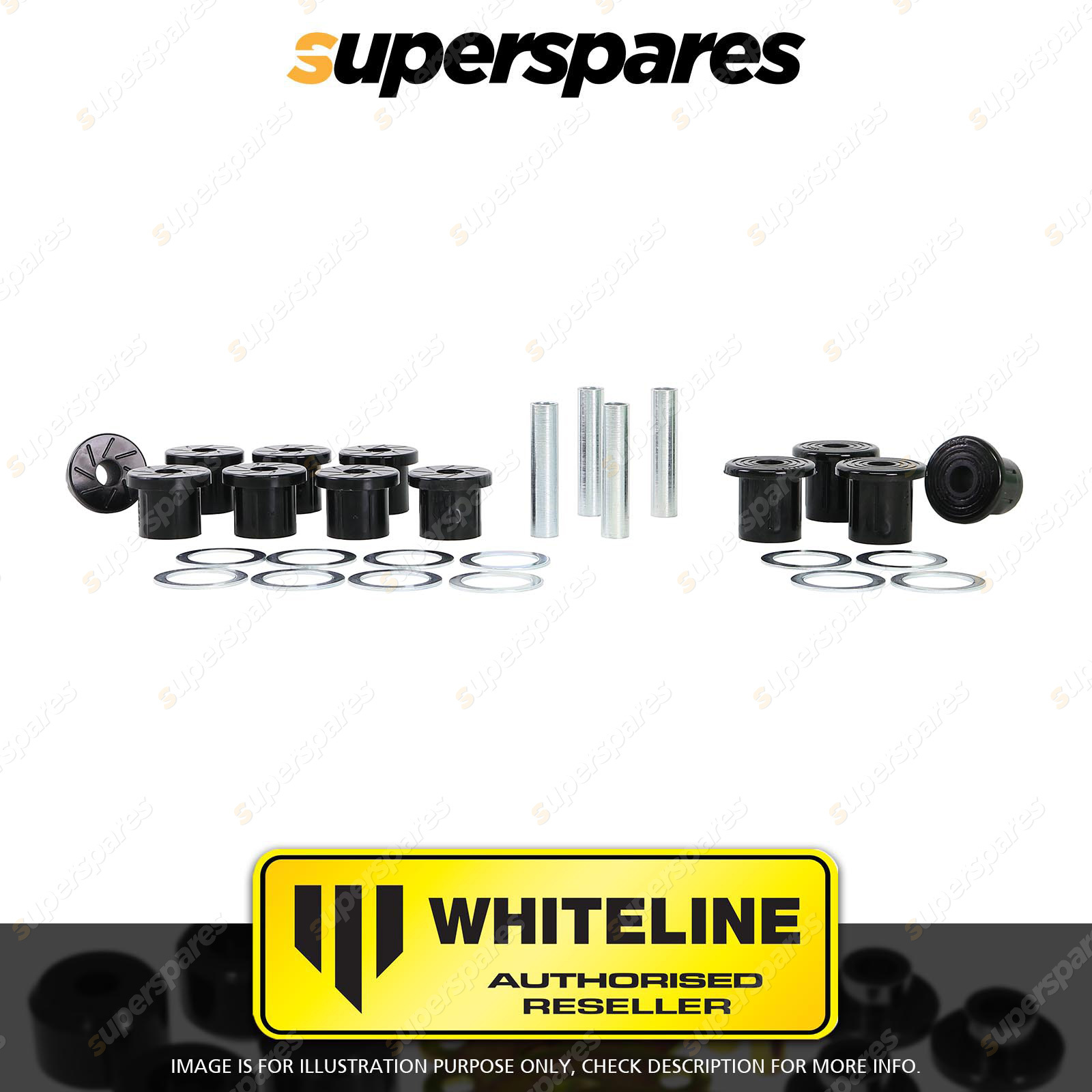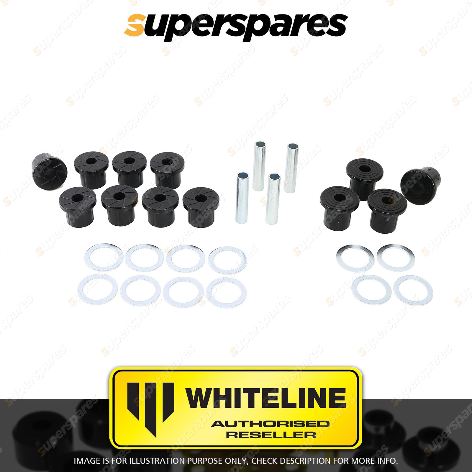 ![]() | Whiteline Spring - Bushing Kit All in one leaf spring bushing service kit covering front and rear eyes of the leaf plus shackle bushings. High kilometres and heavy load carrying causes excessive wear on rubber bushings. Whiteline's signature black bushings are made tough and offer outstanding abrasion resistance, high load bearing capability (4WD's, utes and towing), flexibility, increased tensile strength and chemical resistance to oil, grease, ozone and weathering. |