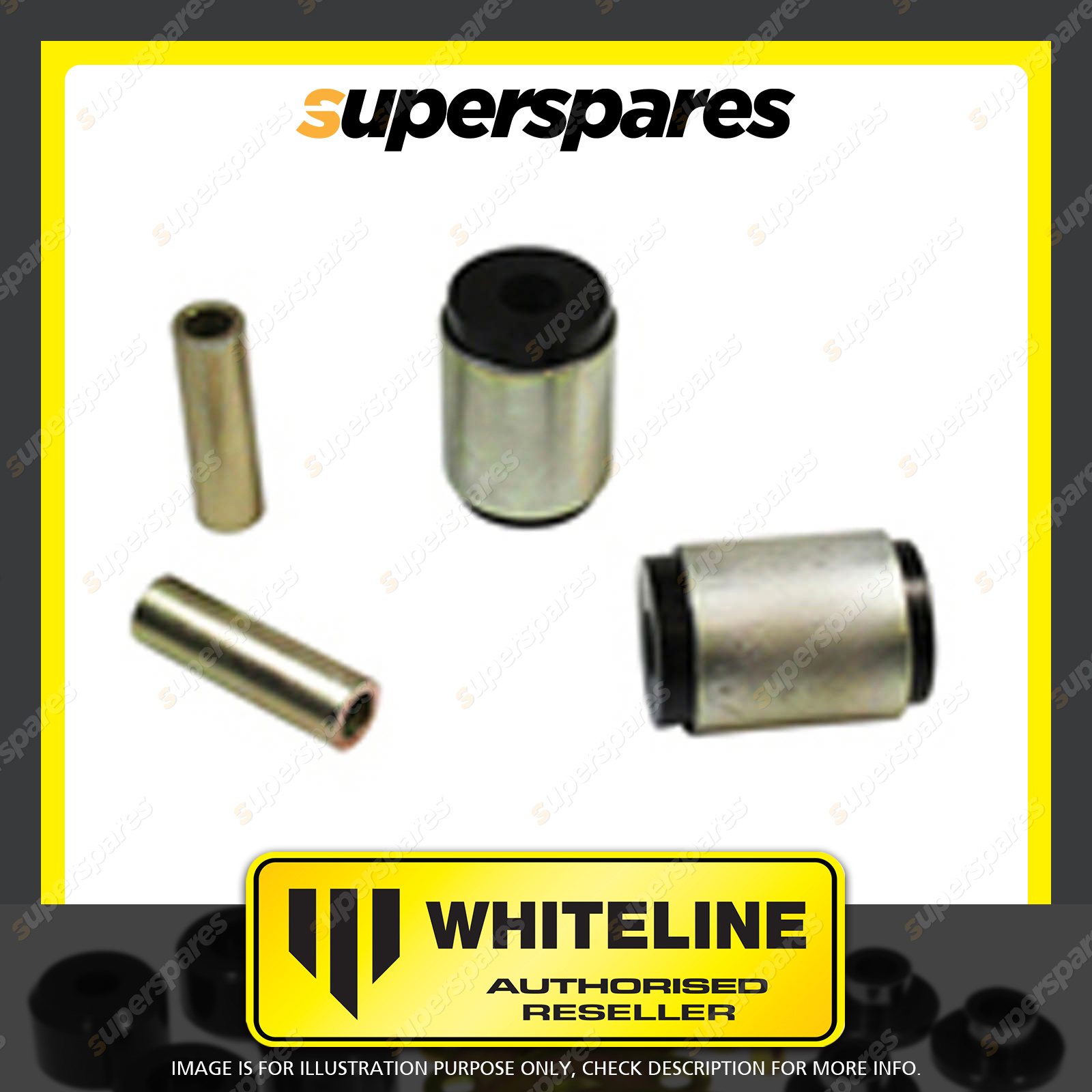 | Contents : Whiteline Rear Spring - eye Front bushing Warranty : 3 Year / 60,000Kms Kit Contents : 2 Shell Bushings, 2 Tubes, Grease |