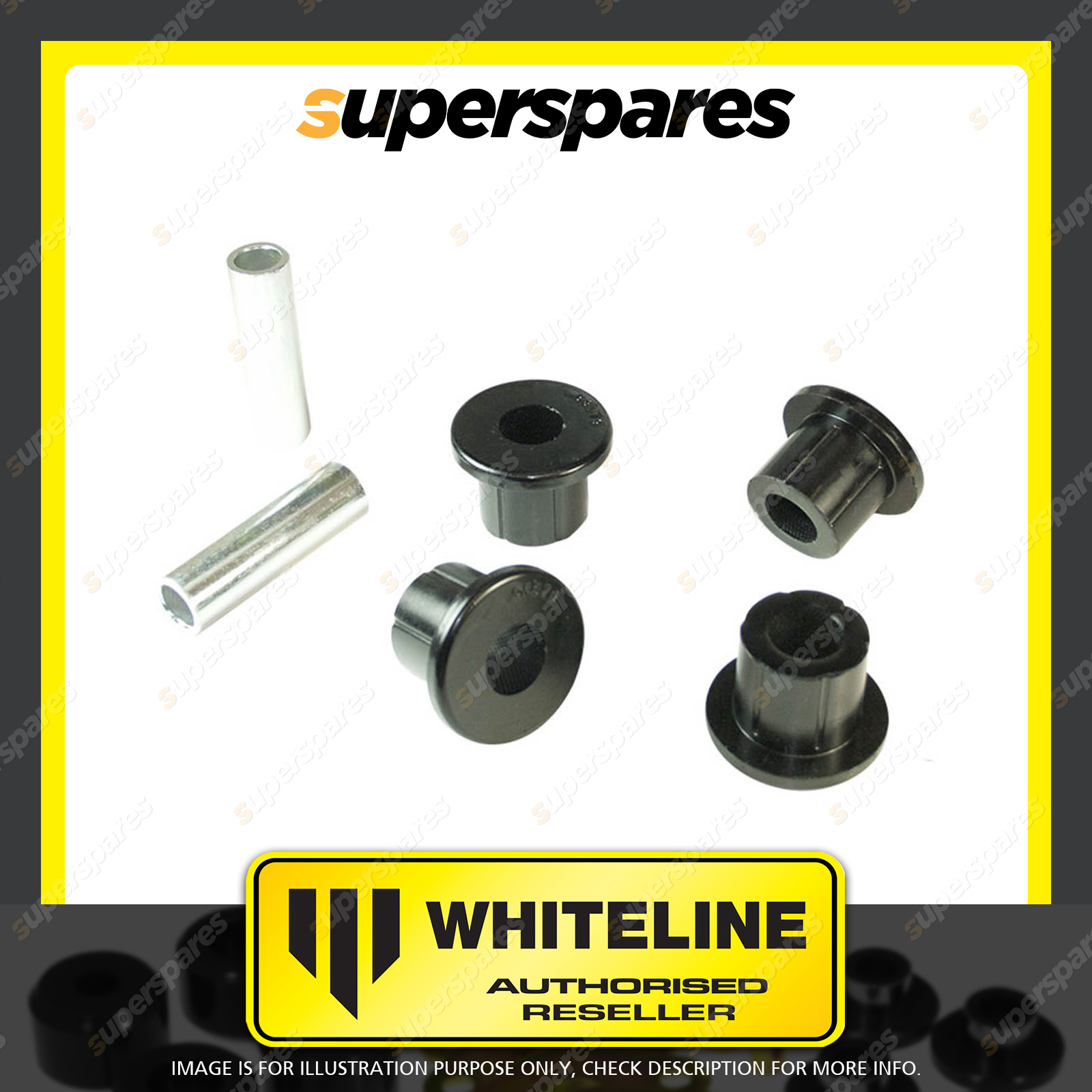 | Contents : Whiteline Rear Spring - eye Front bushing Warranty : 3 Year / 60,000Kms Kit Contents : 4 Bushings, 2 Tubes, Grease |