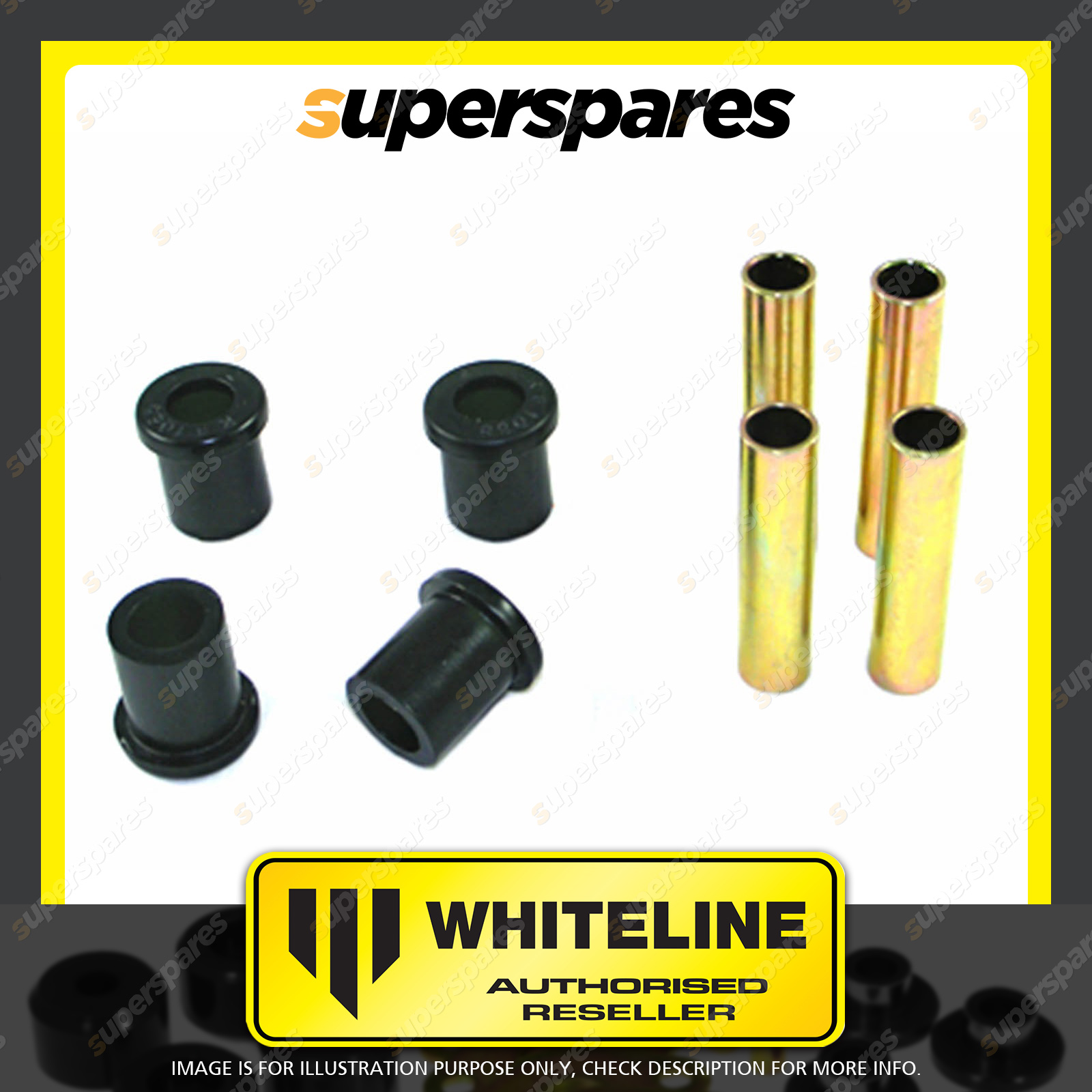 | Contents : Whiteline Rear Spring - eye Front bushing Warranty : 3 Year / 60,000Kms Kit Contents : 4 Bushings, 4 Tubes, Grease |