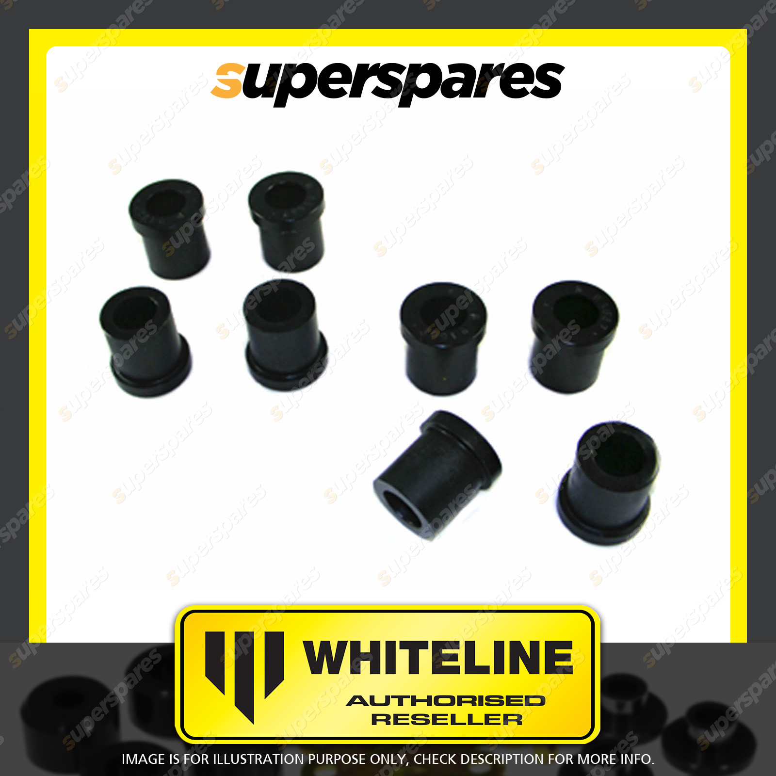 Contents : Whiteline Rear Spring - eye rear and shackle bushing Warranty : 3 Year / 60,000Kms Kit Contents : 8 Bushings, Grease |
