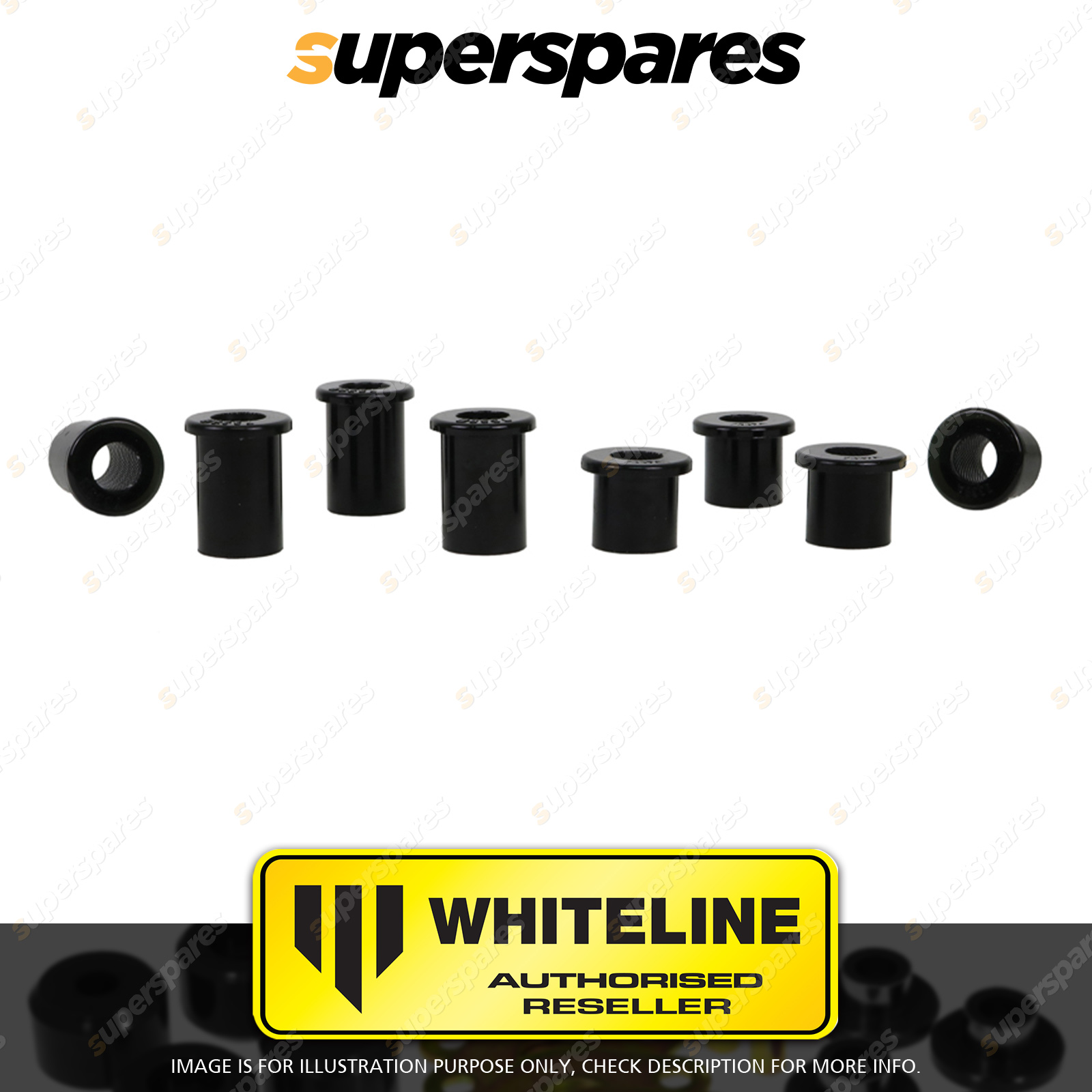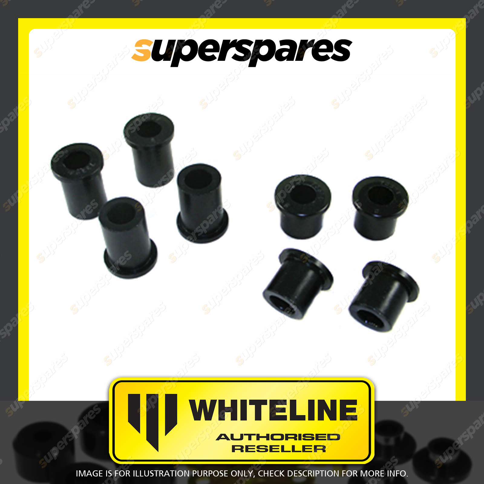 | Contents : Whiteline Rear Spring - eye Rear and shackle bushing Warranty : 3 Year / 60,000Kms Kit Contents : 8 Bushings, Grease |