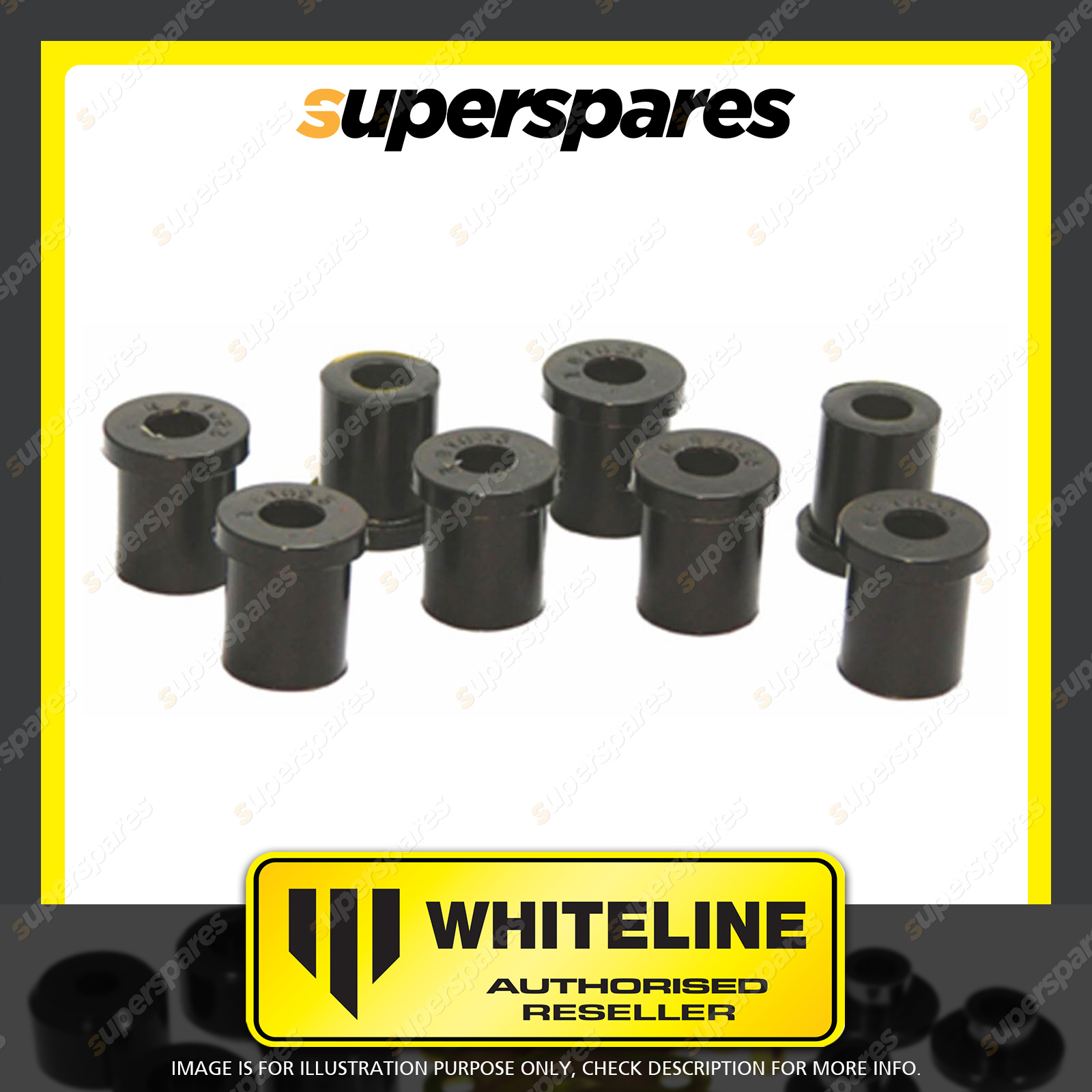 | Contents : Whiteline Rear Spring - eye Rear and shackle bushing Warranty : 3 Year / 60,000Kms Kit Contents : 8 Bushings, Grease |