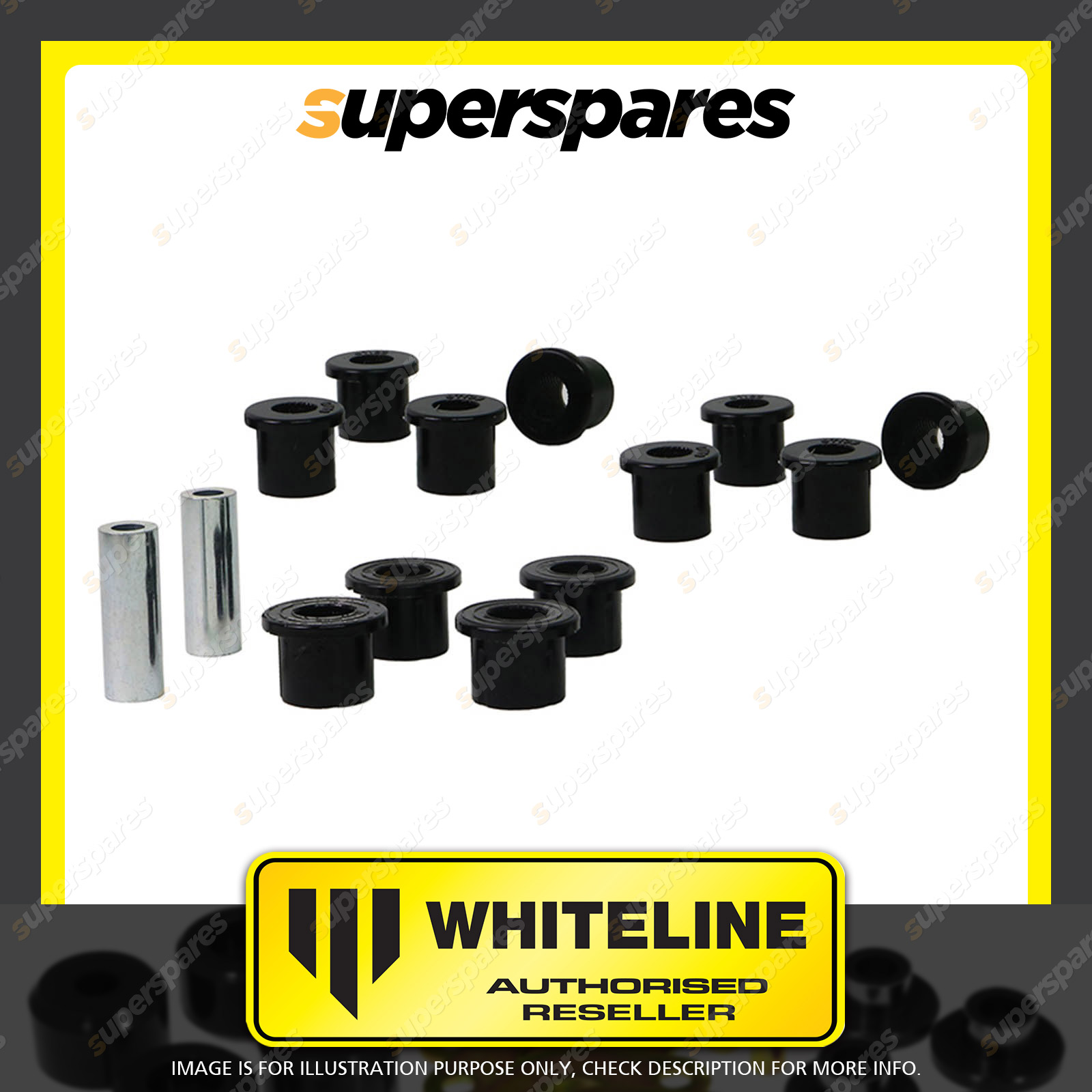 | Contents : Whiteline Rear Spring kit Warranty : 3 Year / 60,000Kms Kit Contents : 12 Bushings, 2 Tubes, Grease |