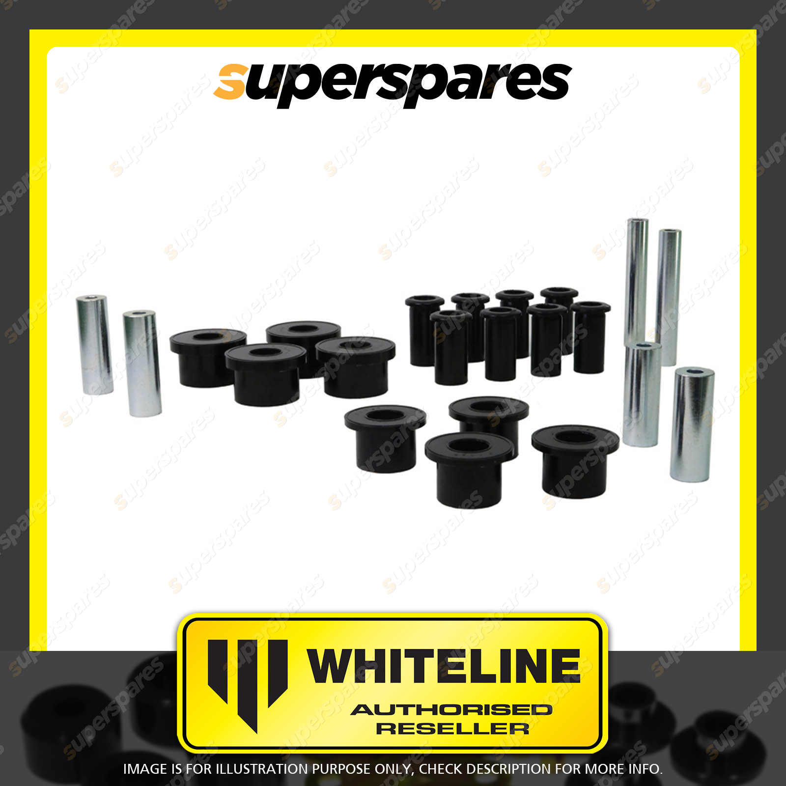 Whiteline Spring Kit All in one leaf spring bushing service kit covering front and rear eyes of the leaf plus shackle bushings. High kilometres and heavy load carrying causes excessive wear on rubber bushings. Whiteline's signature black bushings are made tough and offer outstanding abrasion resistance, high load bearing capability (4WD's, utes and towing), flexibility, increased tensile strength and chemical resistance to oil, grease, ozone and weathering. | |