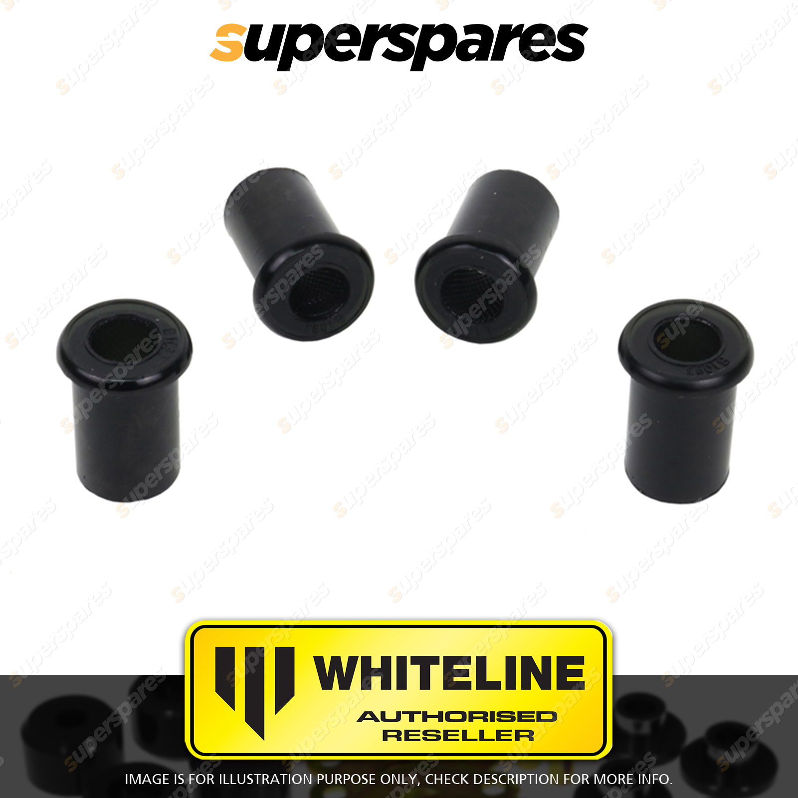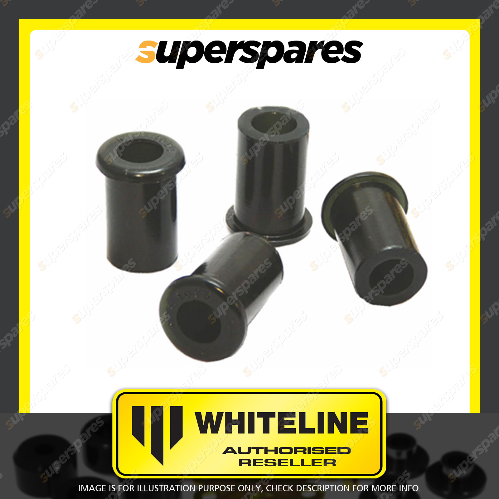 | Contents : Whiteline Rear Spring - shackle bushing Warranty : 3 Year / 60,000Kms Kit Contents : 4 Bushings, Grease |