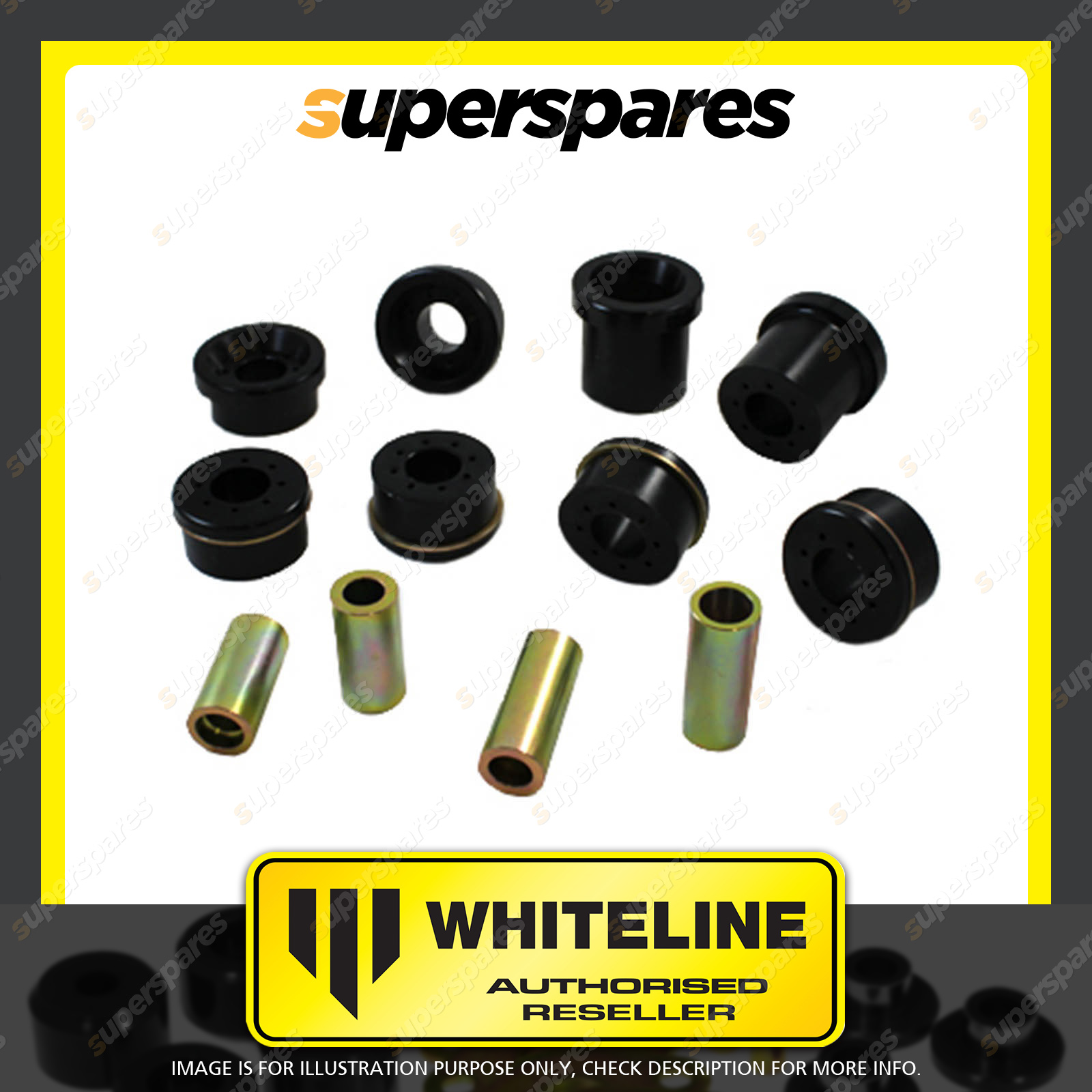 | Contents : Whiteline Rear Subframe - mount bushing Warranty : 3 Year / 60,000Kms Kit Contents : 8 Bushings, 4 Tubes, Install Guide, Grease |