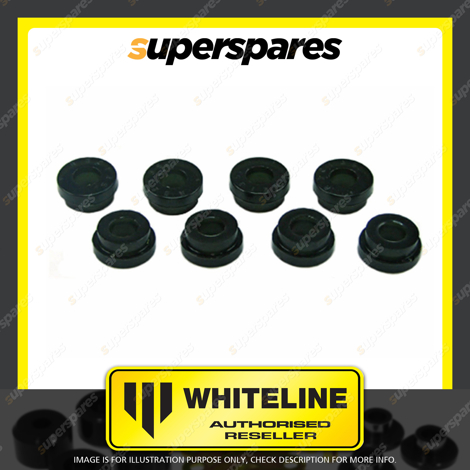 | Contents : Whiteline Rear Subframe - mount bushing Warranty : 3 Year / 60,000Kms Kit Contents : 8 Bushings |