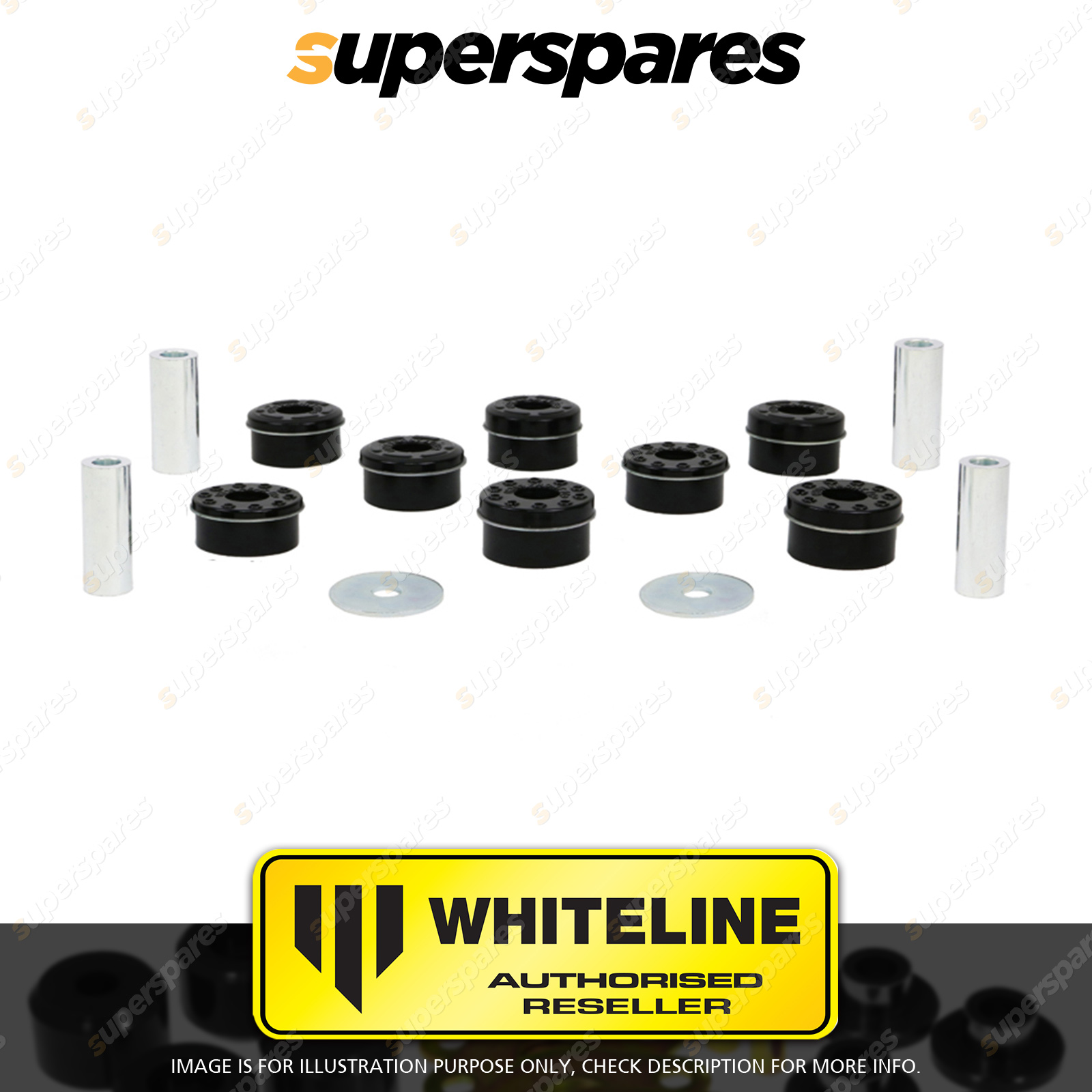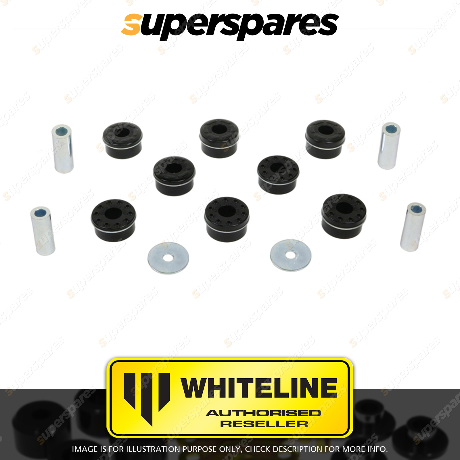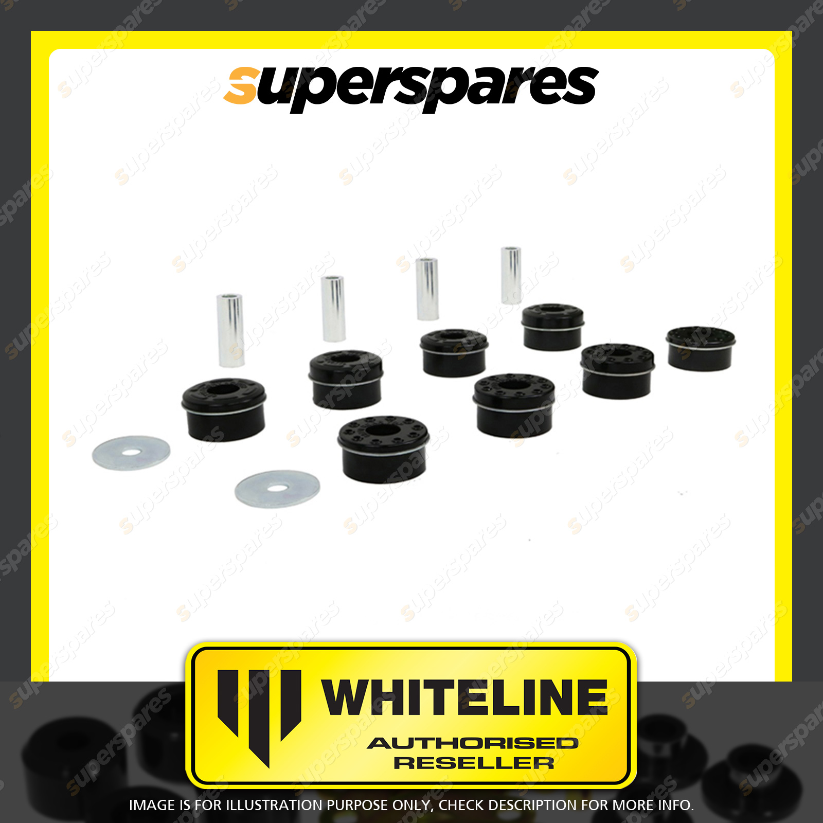 | Contents : Whiteline Rear Subframe - mount bushing Warranty : 3 Year / 60,000Kms Kit Contents : 8 Bushings, 4 Tubes, 2 Washers, Install Guide, Grease |