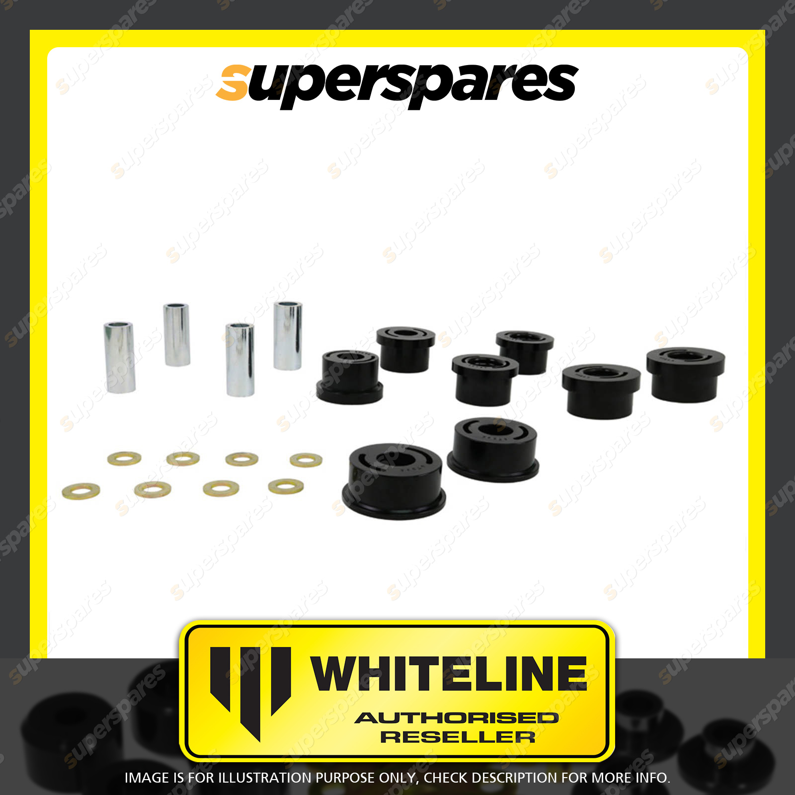 | Contents : Whiteline Rear Subframe - mount Front bushing Warranty : 3 Year / 60,000Kms Kit Contents : 8 Bushings, 4 Tubes, 8 Washers, Install Guide, Grease |
