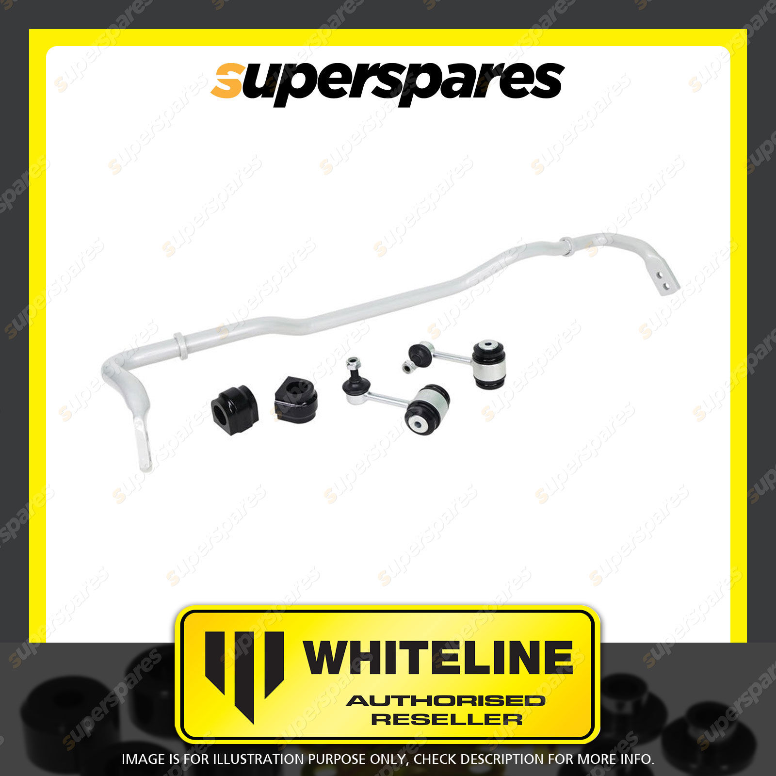 | Contents : Whiteline Rear Sway Bar - 24mm 2 Point Adjustable Warranty : 3 Year / 60,000Kms Kit Contents : 1 Sway Bar, 2 Links, 2 Bushings |