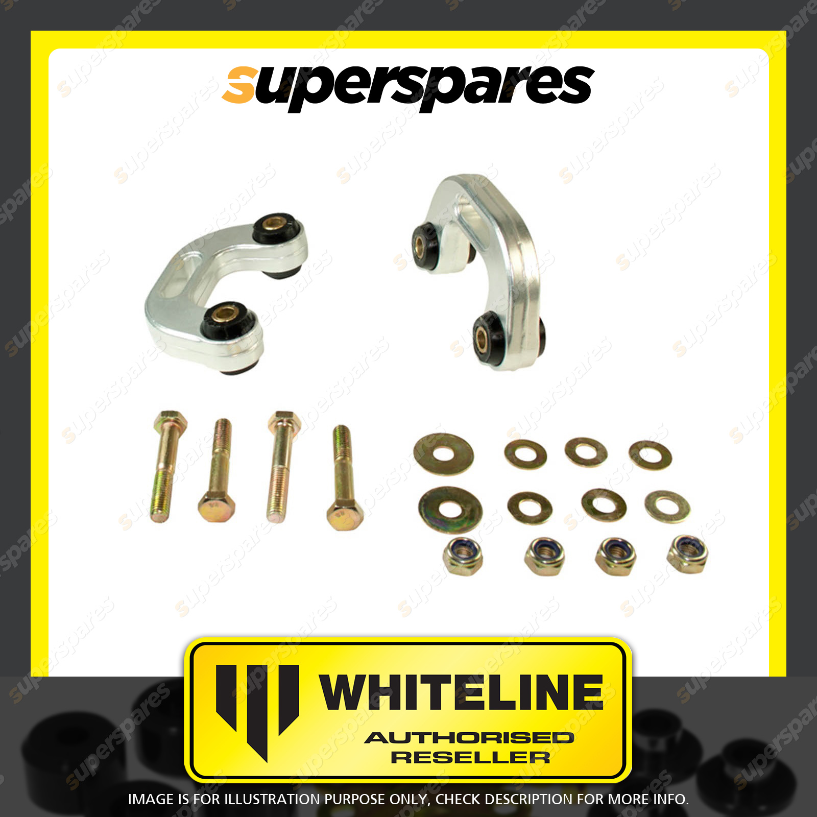 | Contents : Whiteline Rear Sway bar - link Warranty : 3 Year / 60,000Kms Kit Contents : 2 Links, 4 Bolts, 8 Washers, 4 Nuts, Install Guide, Grease | Kit Specifications : Link Type : Bushing |