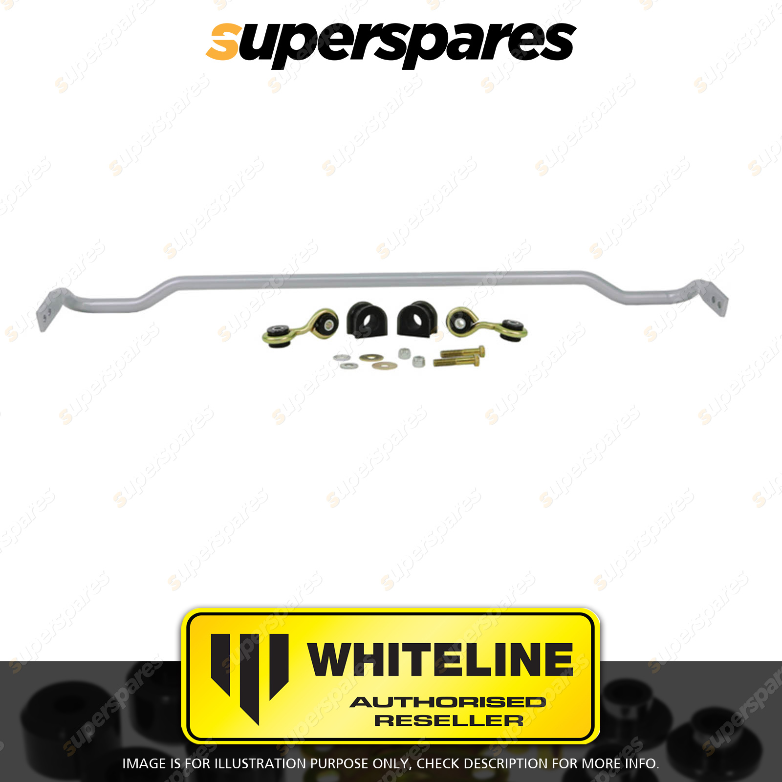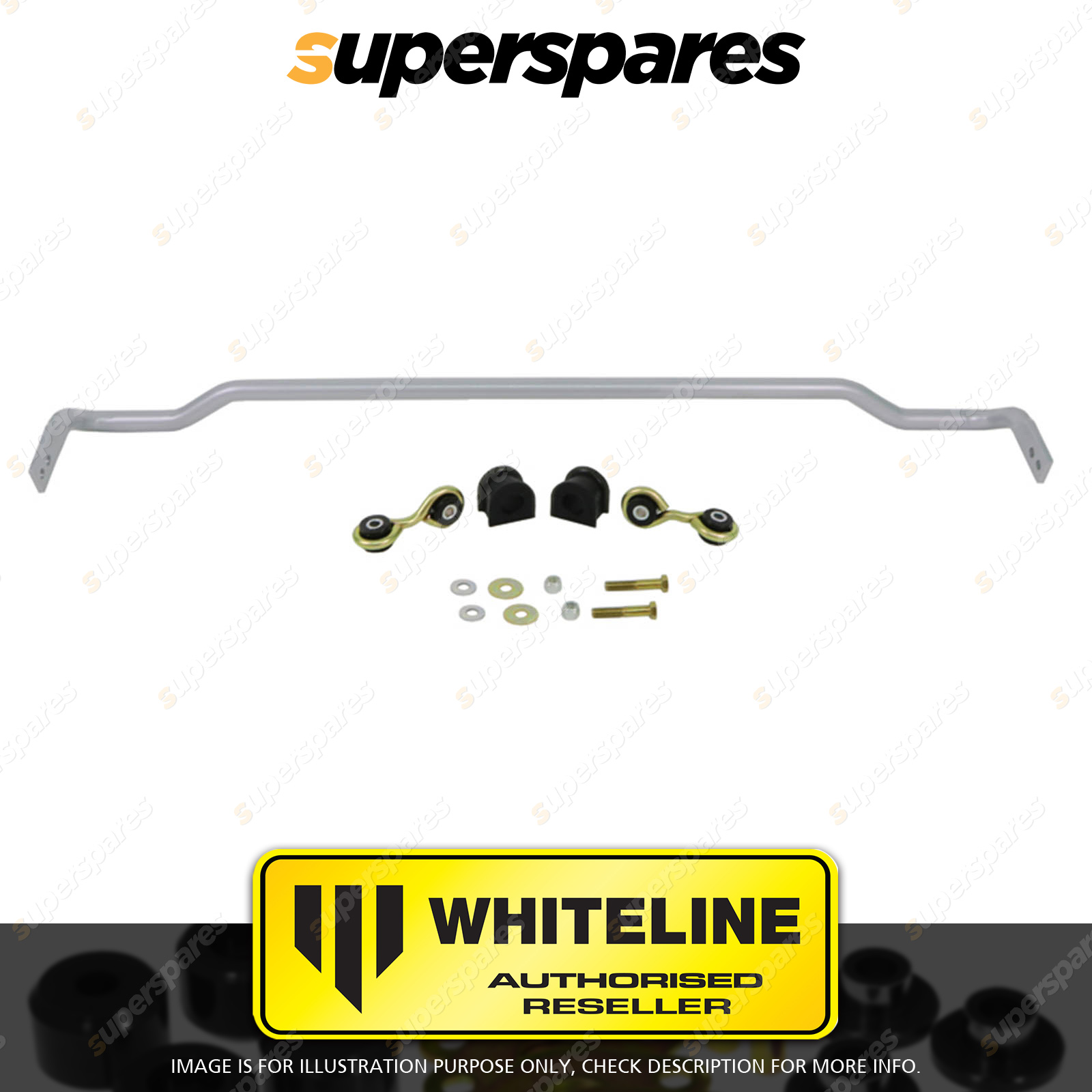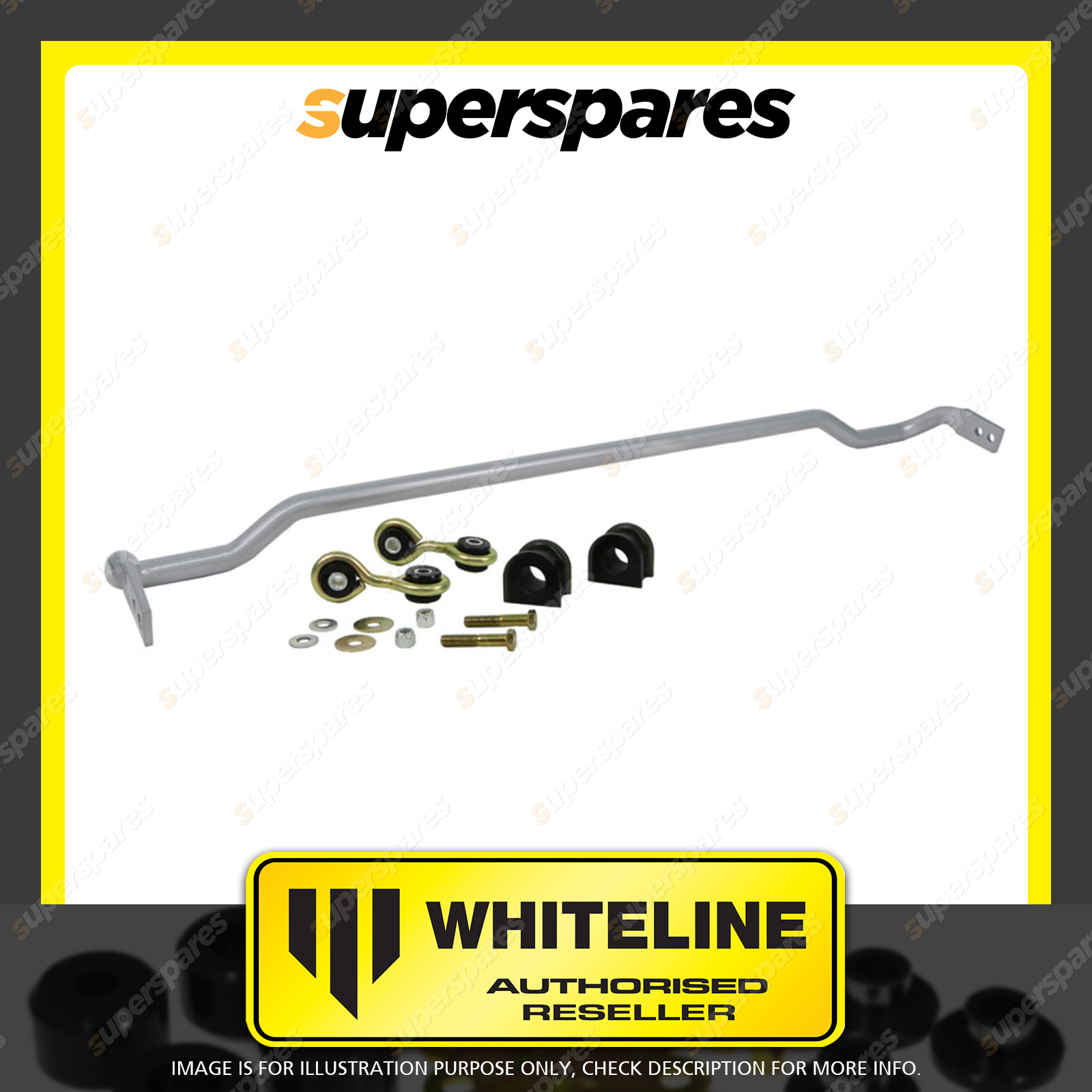 | Contents : Whiteline Rear Sway bar Warranty : 3 Year / 60,000Kms Kit Contents : 1 Sway Bar, 2 Links, 2 Bushings, 2 Bolts, 4 Washers, 2 Nuts, Install Guide, Grease | Kit Specifications : Diameter(mm) : 24mm |