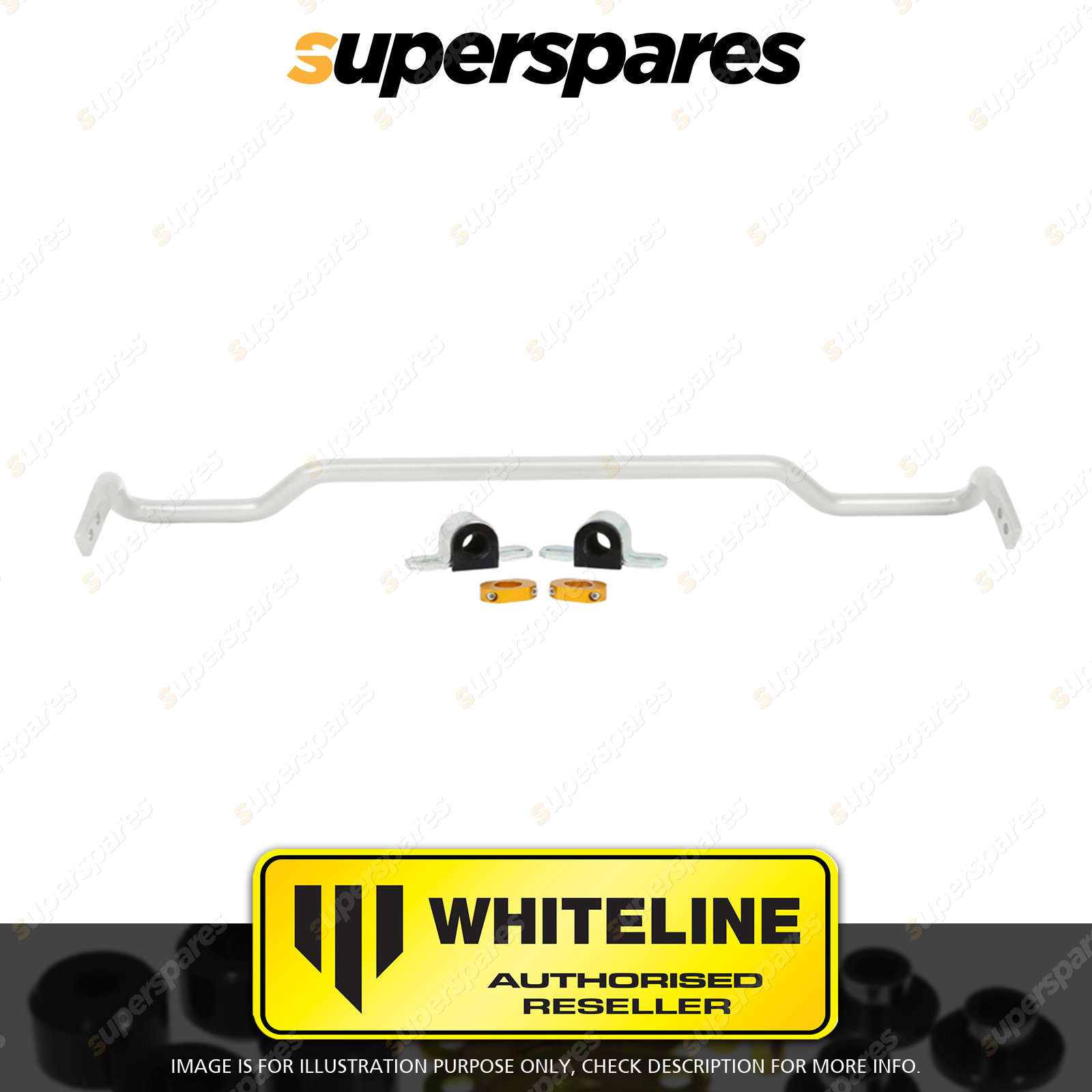 | Contents : Whiteline Rear Sway bar Warranty : 3 Year / 60,000Kms Kit Contents : 1 Sway Bar, 2 Bushings, 2 Saddles, 2 Lateral Locks, Install Guide | Kit Specifications : Diameter(mm) : 22mm |