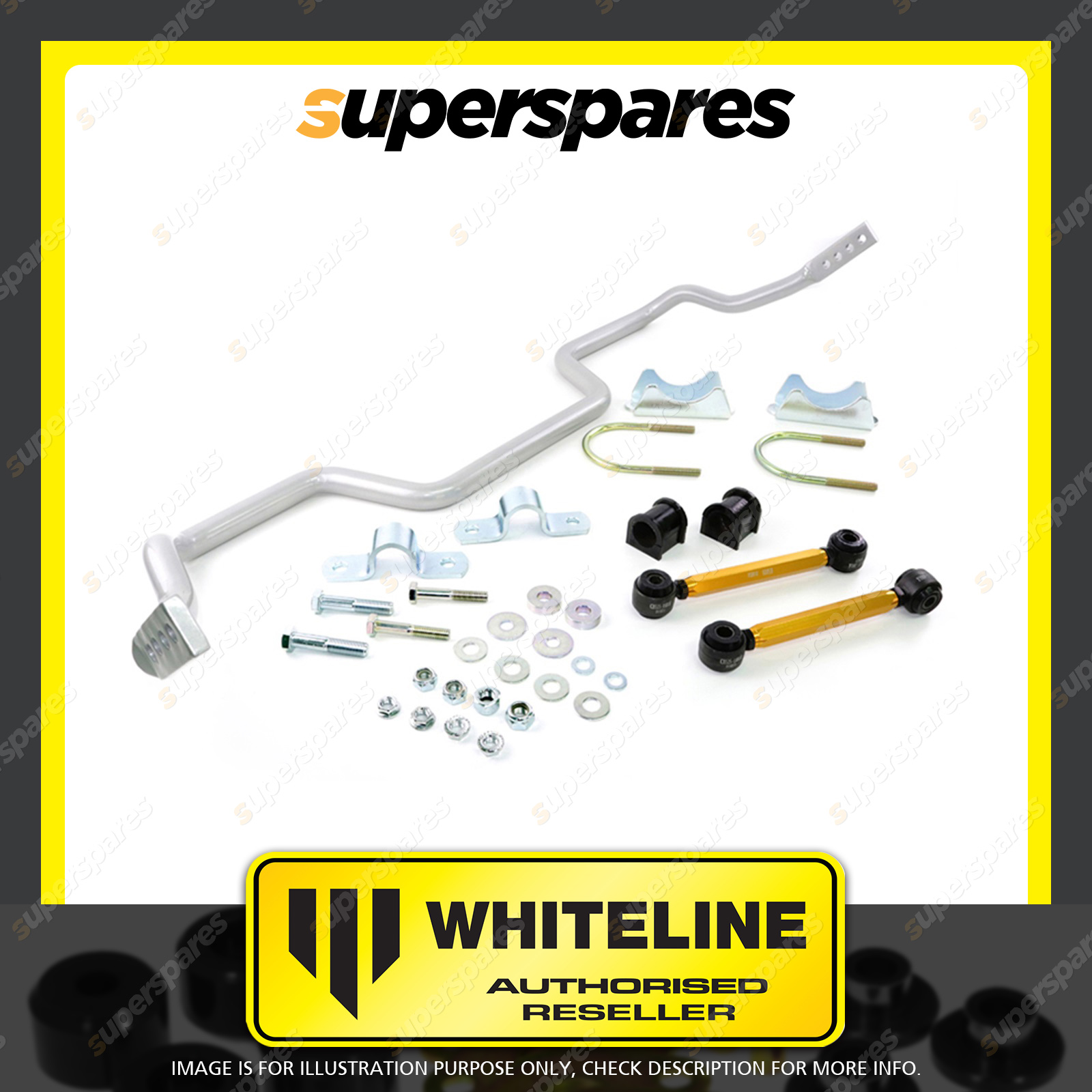 | Contents : Whiteline Rear Sway bar Warranty : 3 Year / 60,000Kms Kit Contents : 1 Sway Bar, 2 Links, 2 Bushings, 2 Saddles, 2 Plates, 2 U-Bolts, 4 Bolts, 10 Washers, 8 Nuts, Install Guide | Kit Specifications : Diameter(mm) : 27mm |