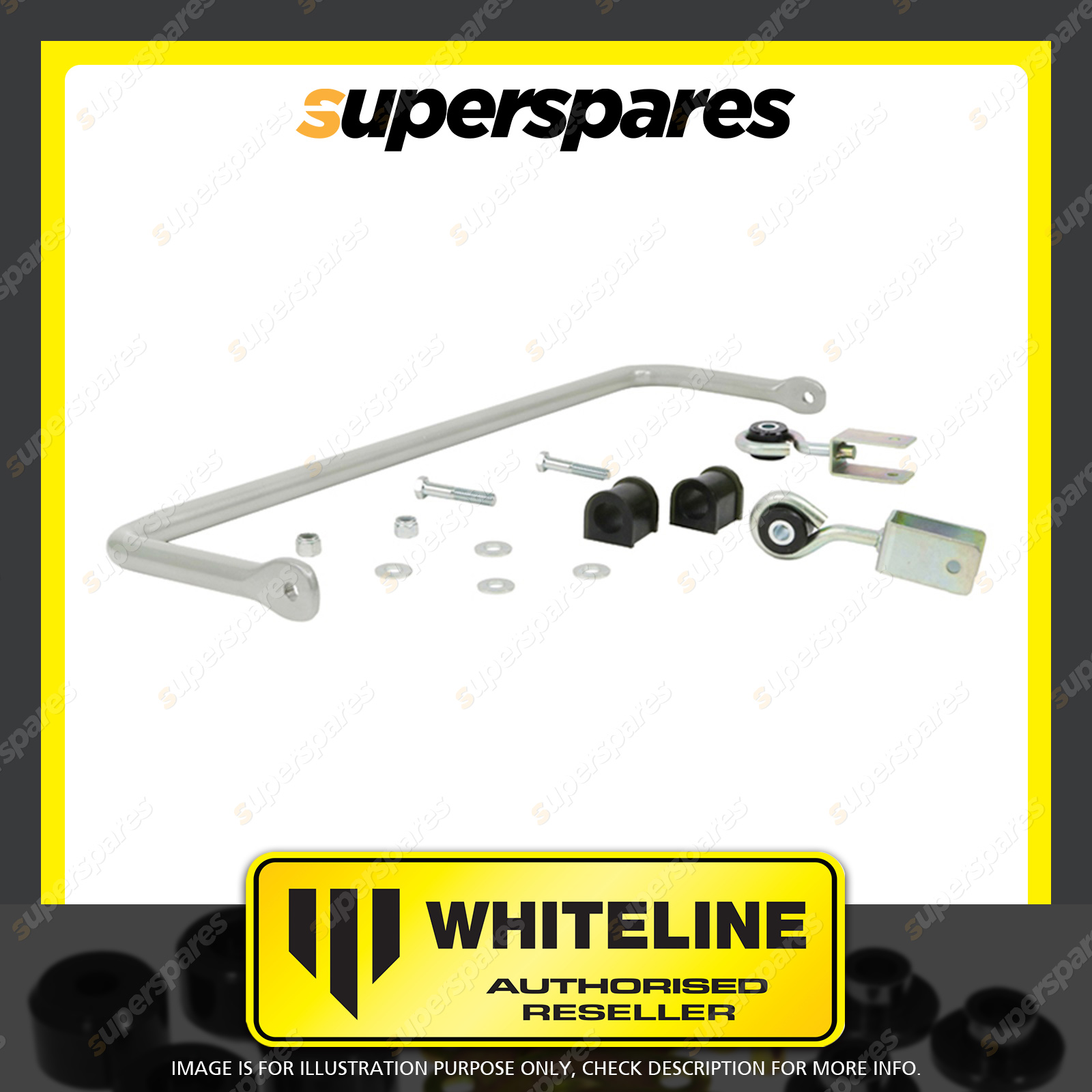 | Contents : Whiteline Rear Sway bar Warranty : 3 Year / 60,000Kms Kit Contents : 1 Sway Bar, 2 Links, 2 Bushings, 2 Bolts, 4 Washers, 2 Nuts, Install Guide, Grease | Kit Specifications : Diameter(mm) : 20mm |