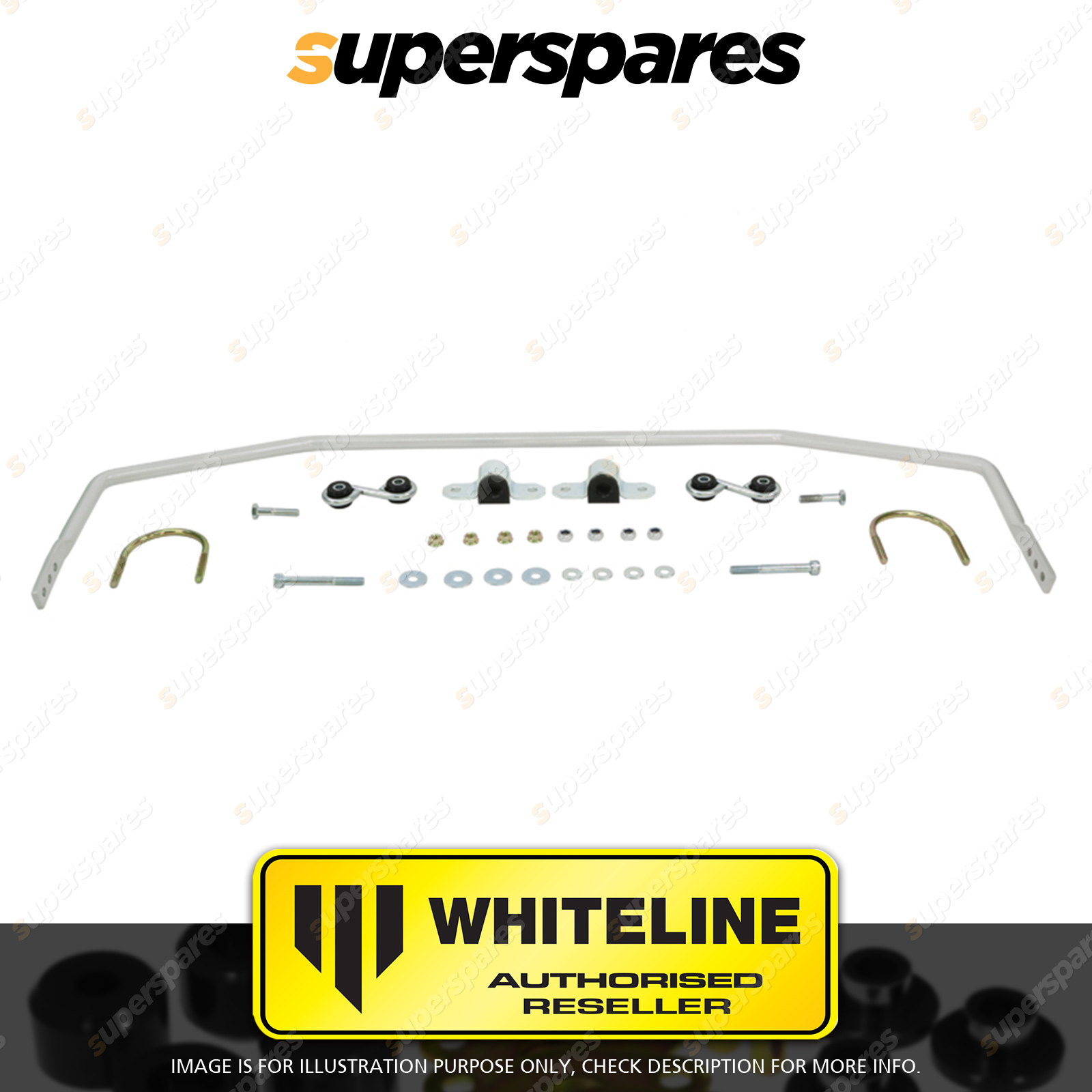 | Contents : Whiteline Rear Sway bar Warranty : 3 Year / 60,000Kms Kit Contents : 1 Sway Bar, 2 Links, 2 Bushings, 2 Saddles, 2 U-Bolts, 4 Bolts, 8 Washers, 8 Nuts, Install Guide | Kit Specifications : Diameter(mm) : 20mm |