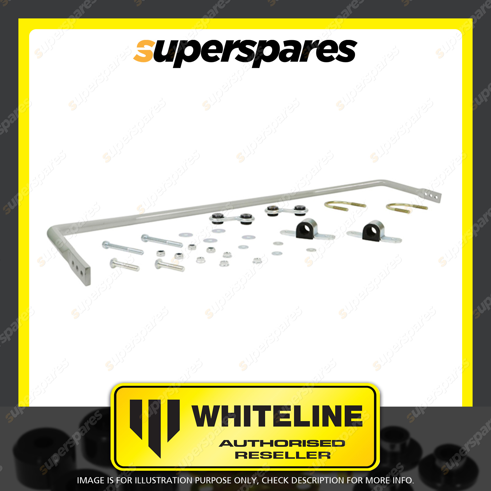 | Contents : Whiteline Rear Sway bar Warranty : 3 Year / 60,000Kms Kit Contents : 1 Sway Bar, 2 Links, 2 Bushings, 2 Saddles, 2 U-Bolts, 4 Bolts, 8 Washers, 8 Nuts, Install Guide | Kit Specifications : Diameter(mm) : 24mm |