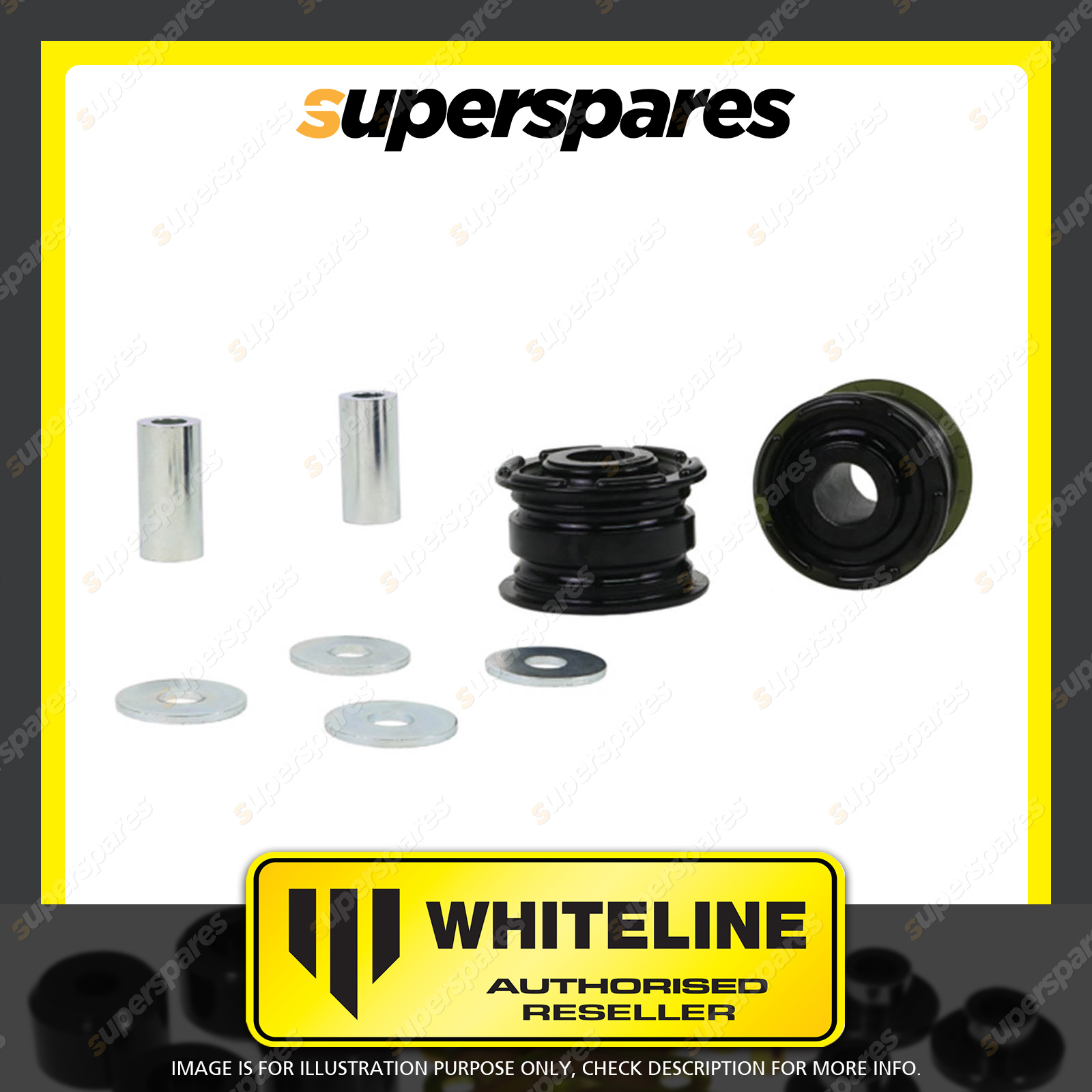 | Contents : Whiteline Rear Trailing arm - Front bushing Warranty : 3 Year / 60,000Kms Kit Contents : 2 Bushings, 2 Tubes, 4 Washers, Grease |