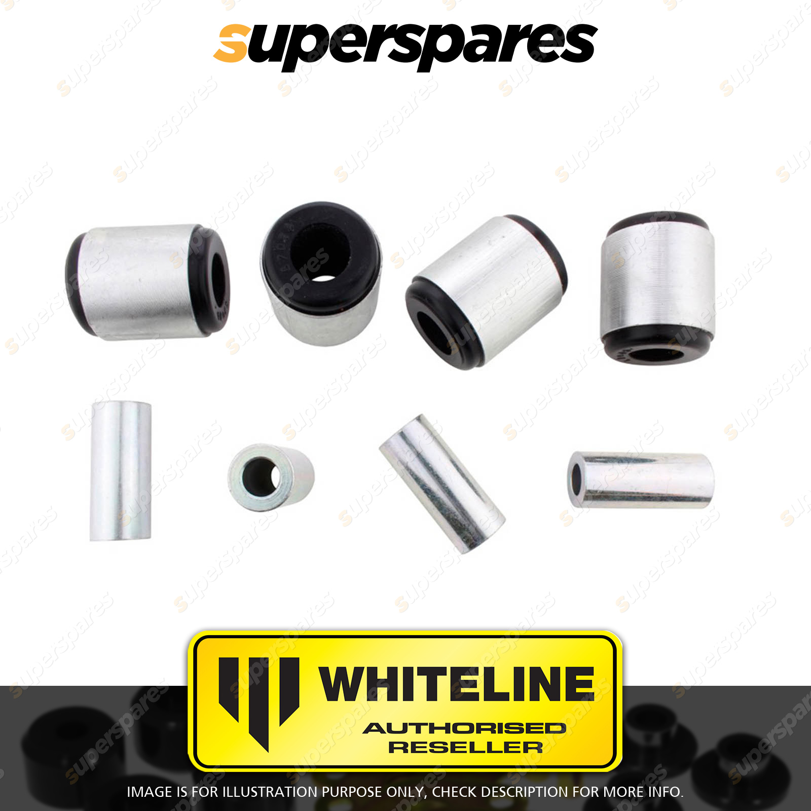 | Contents : Whiteline Rear Trailing arm - upper bushing Warranty : 3 Year / 60,000Kms Kit Contents : 4 Shell Bushings, 4 Tubes, Grease |
