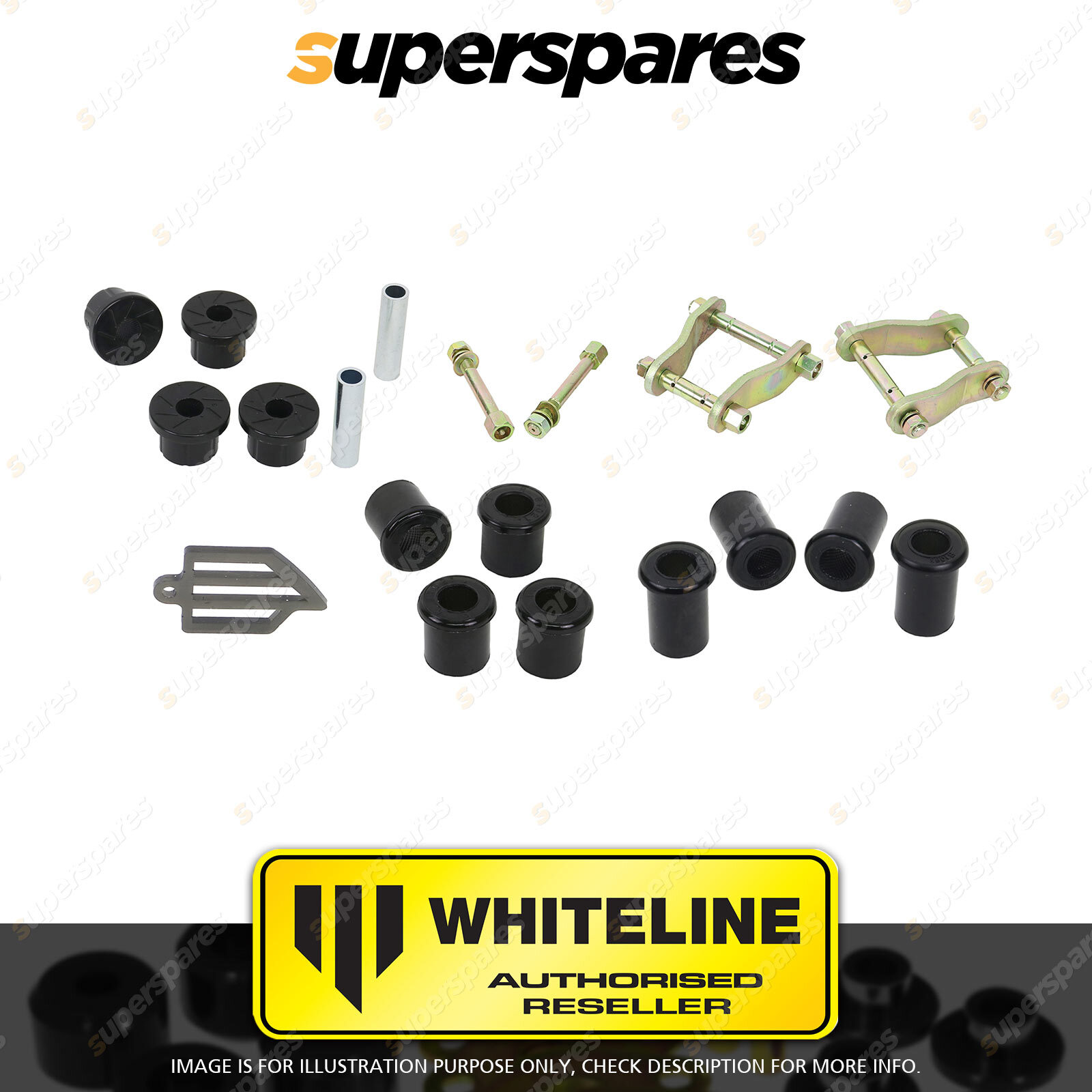 Contents : Whiteline Vehicle Essentials - Shakle Pin Bushing Kit Position : Rear Warranty : 3 Year / 60,000KMS Kit Contents : 2 Shackles, 2 Pins, 12 Bushings, 2 Tubes, grease |