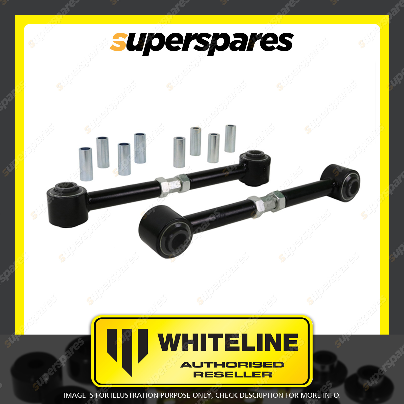 | Contents : Whiteline Rear upper Trailing arm Warranty : 3 Year / 60,000Kms Kit Contents : 2 Arms, 8 Tubes, Grease |